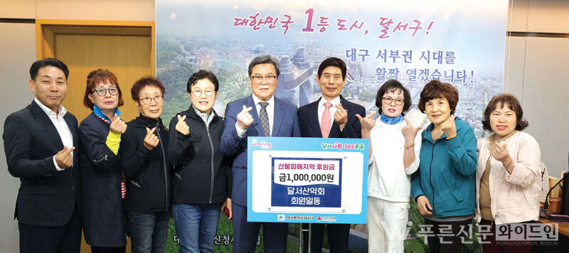 서산악회(회장 김복수)는 산불 피해지역 지원을 위한 후원금 100만 원을 달서구에 기탁했다. 김복수 회장은 “작은 도움이지만 희망이 되길 바라며, 앞으로도 나눔과 봉사를 실천하는 산악회가 되겠다.”고 말했다.