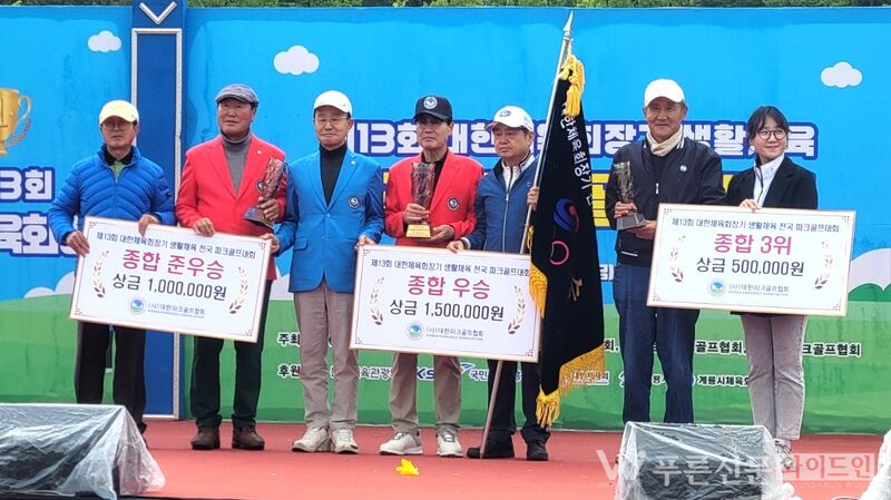 ▲종합 우승 경상남도, 종합 준우승 충청남도, 종합 3위 경기도가 차지한 가운데 시상식이 열리고 있다. 〔사진=대한파크골프협회〕