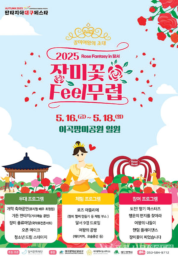 (재)달서문화재단(이사장 이태훈)은 5월 16일(금)~18일(일)까지 이곡장미공원에서 봄 축제 ‘2025 장미꽃 필(Feel) 무렵’을 개최한다.