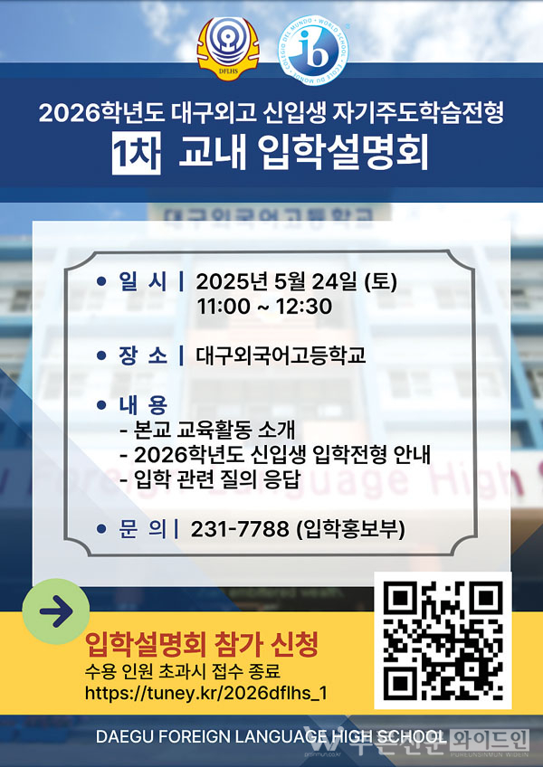 대구외국어고등학교(교장 홍병우)는 오는 5월 24일(토) 오전 11시, 학교 내에서 2026학년도 자기주도학습전형 1차 입학설명회를 연다. 이번 설명회는 변화하는 대입 환경 속에서 고교 선택에 필요한 정보를 조기에 제공하기 위해 마련됐다.