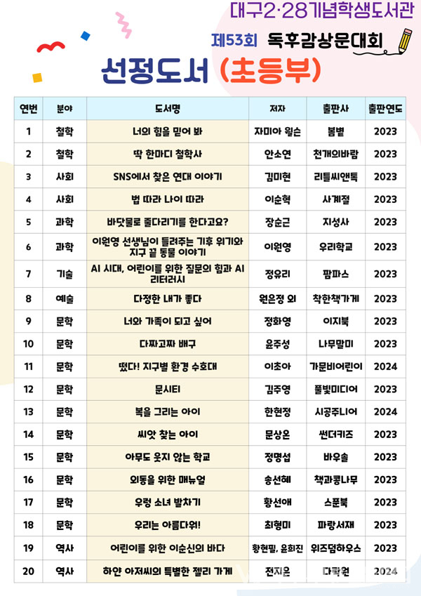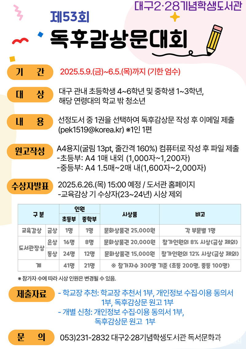 대구2·28기념학생도서관이 지역 청소년들의 독서 습관을 장려하고 글쓰기 능력 향상을 돕기 위해 ‘제53회 독후감상문대회’를 개최한다.