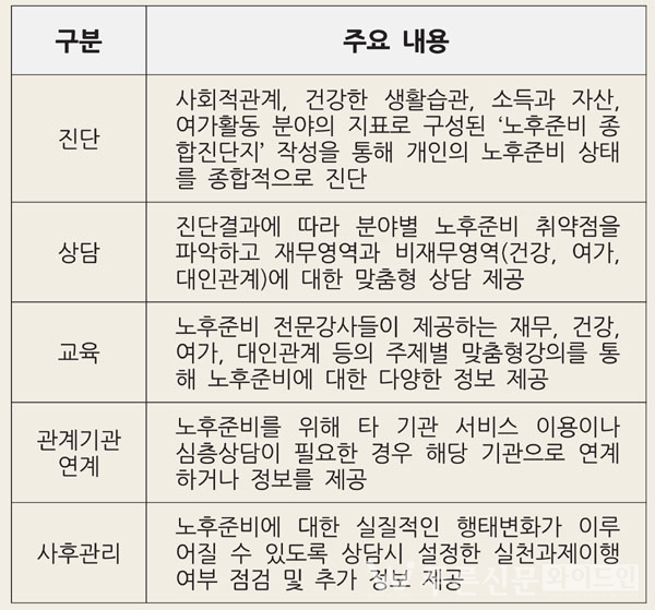 공단의 노후준비서비스는 노후준비 종합진단 결과를 바탕으로 부족한 부분에 대한 맞춤형 상담을 제공하며, 필요시 관계기관의 다양한 전문서비스 연계를 통해 노후준비를 위한 종합적인 지원을 하고 있어 타 공공·민간영역의 개별적·부분적 서비스와 구별되는 장점을 갖추고 있습니다.