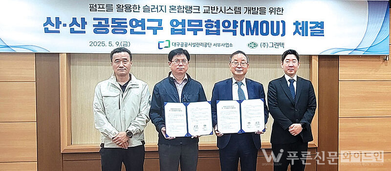 대구공공시설관리공단 서부사업소(이사장 문기봉)와 ㈜그린텍은 지난 9일(금) ‘펌프를 활용한 슬러지 혼합탱크 교반시스템’ 공동 기술개발을 위한 업무협약을 체결했다. 이번 협약은 환경기술 분야의 전문성과 경쟁력을 강화하고, 민간기업 간 협력을 통한 상생을 목표로 마련됐다. 양측은 실증 플랜트 설치, 성능 검증 등에서도 협력할 예정이다.