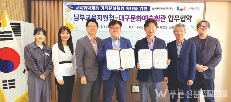 대구남부교육지원청(교육장 류호)은 지난 8일(목) 대구문화예술회관(관장 김희철)과 교육취약계층 학생과 가족들의 문화예술 체험 기회 확대를 위한 업무협약을 체결했다.