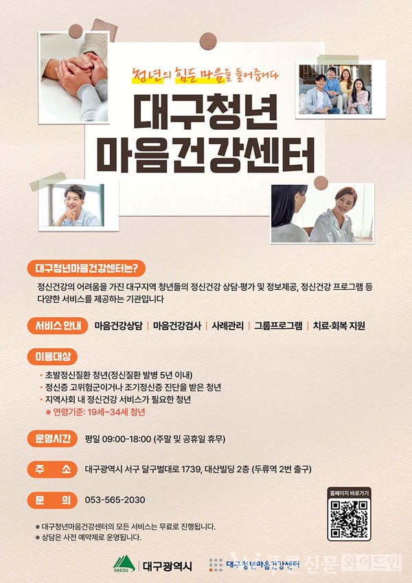자세한 사항은 대구청년마음건강센터 홈페이지(www.youthdgmhc.or.kr) 또는 대구청년마음건강센터 ☎053-565-2030으로 문의하면 된다.