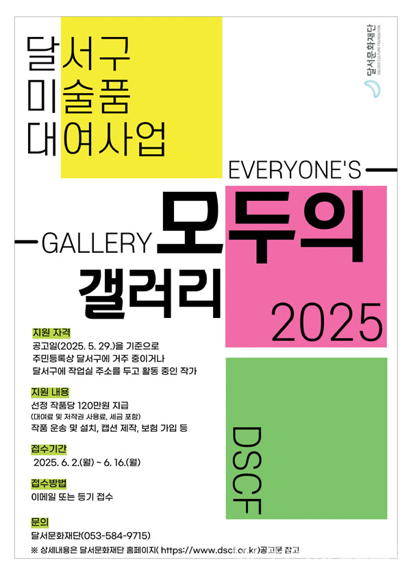 (재)달서문화재단은 오는 6월 16일(월)까지 ‘모두의 갤러리’ 미술품 대여사업에 참여할 지역 작가 작품을 공개 모집한다.