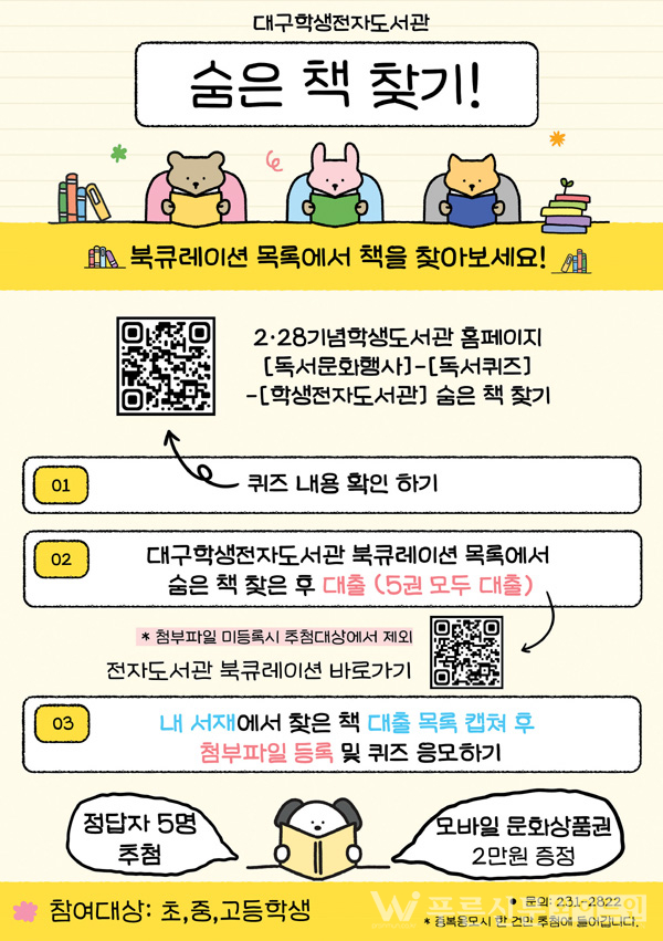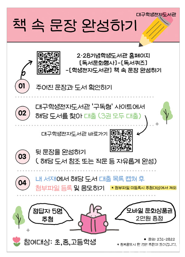 초·중·고 학생 대상이며, 대구2·28기념학생도서관 홈페이지를 통해 참여 가능하다.