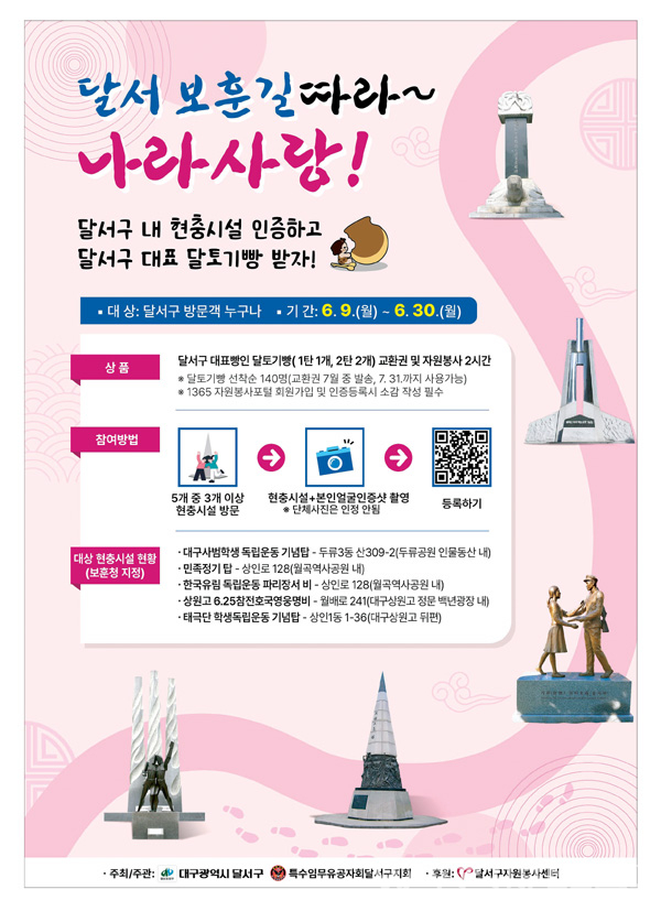 달서구(구청장 이태훈)는 6월 호국보훈의 달을 맞아 지역 내 현충시설을 탐방하고 인증하면 특산물과 자원봉사 혜택을 받을 수 있는 ‘달서 보훈길 따라~ 나라사랑!’ 이벤트를 운영한다.