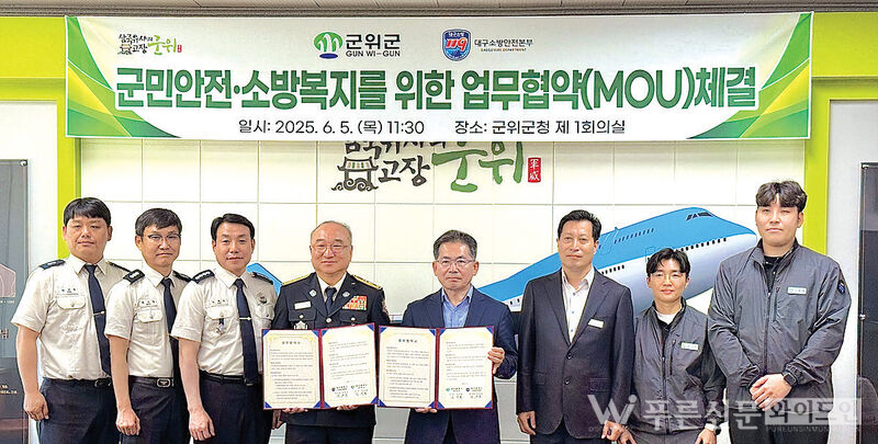 대구소방안전본부(본부장 엄준욱)와 군위군(군수 김진열)은 지난 5일(목) 군위군청에서 지역 안전환경 조성과 소방가족 복지 증진을 위한 업무협약(MOU)을 체결했다.