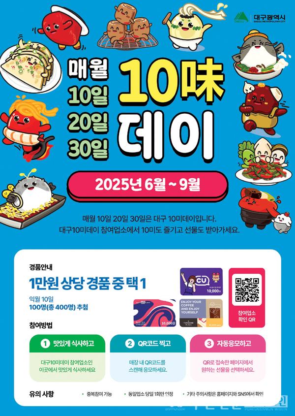 대구광역시는 올해 지정 20주년을 맞은 향토 음식 ‘대구10미’의 인지도 향상과 지역 외식업계 활성화를 위해 9월까지 매월 10, 20, 30일을 ‘대구10미데이’로 지정해 다양한 혜택과 이벤트를 진행한다.