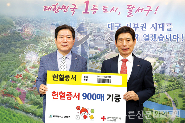 달서구는 세계헌혈자의 날을 맞아 5월 한 달간 진행한 ‘이웃사랑 헌혈증서 모으기’ 행사에서 모인 헌혈증서 900매를 지난 11일(수) 대한적십자사 대구경북혈액원에 전달했다.