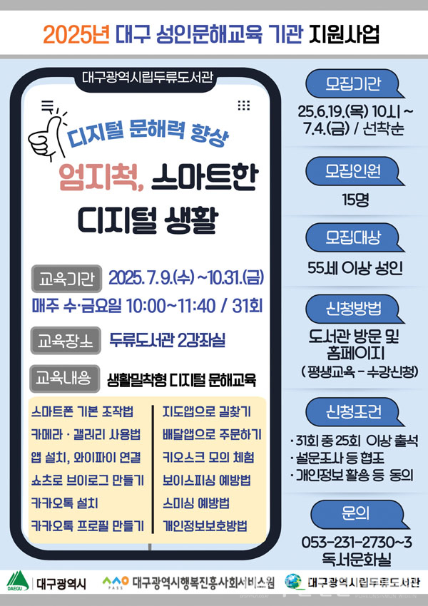 대구두류도서관은 7~10월까지 운영하는 디지털 문해력 향상 프로그램 ‘엄지척, 스마트한 디지털 생활’ 수강생을 선착순 모집한다.