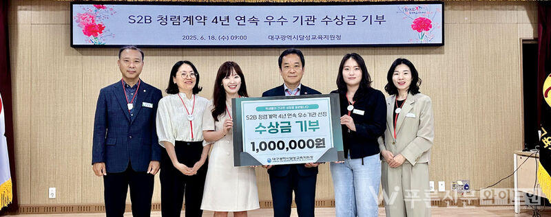 대구달성교육지원청(교육장 김현우)은 S2B(학교장터) 청렴계약 우수기관 선정으로 받은 상금 100만 원을 관내 취약계층 학생들을 위해 기부했다.