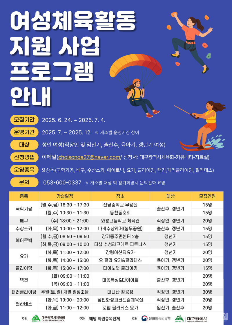 대구광역시체육회(회장 박영기)가 여성의 건강 증진과 여가활동 활성화를 위해 ‘2025 여성 체육활동 지원 사업’을 본격 추진한다.