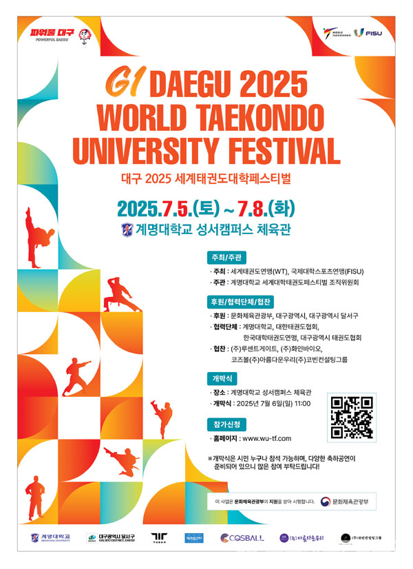 계명대학교(총장 신일희)에서 오는 7월 5일(토)~8일(화)까지 4일간 ‘대구2025세계대학태권도 페스티벌’이 열린다.