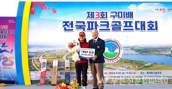 ▲작년 제3회 구미배 전국 파크골프대회에서 MVP룰 차지한 구미 이유정 선수가 정성기 협회장으로부터 상금 3천만 원과 트로피를 받고 있다. 〔사진=김영조 기자〕
