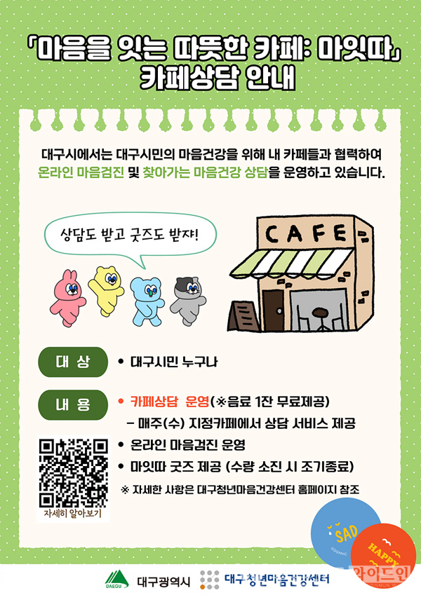 대구시는 우울·불안·스트레스 등 심리적 어려움을 겪고 있는 시민 누구나 편하게 이용할 수 있는 ‘마음을 잇는 따뜻한 카페(마잇따)’를 운영 중이다.