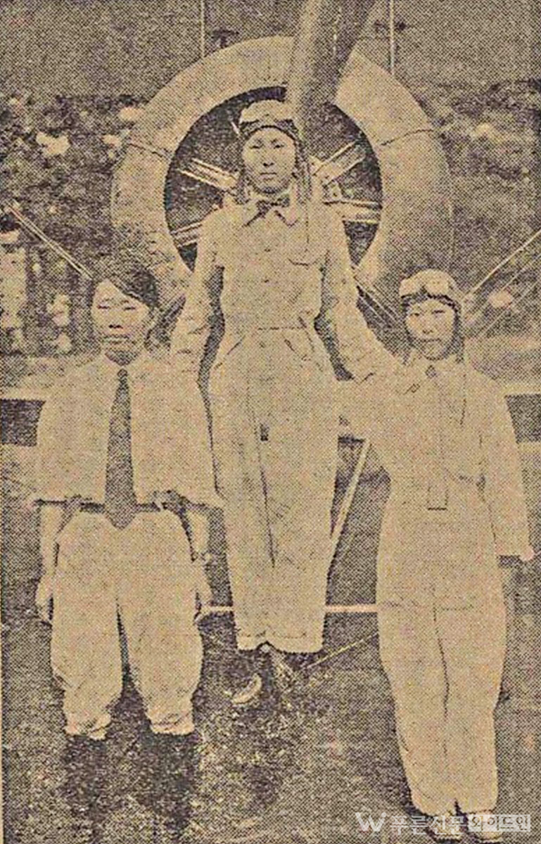 다치카와비행학교 재학 시절 박경원(중간)_매일신보 1933년 8월 9일자 수록된 사진) [출처: 대한민국 신문 아카이브]