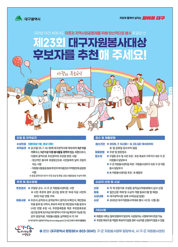 대구시는 지역사회에 헌신한 자원봉사자를 발굴하기 위해 오는 8월 22일(금)까지 ‘제23회 대구자원봉사대상’ 후보자를 공개 모집한다.