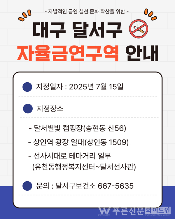 달서구(구청장 이태훈)는 지난 15일(화)부터 간접흡연 민원이 자주 발생하는 달서별빛캠핑장, 상인역 뒤 광장 일대, 선사시대로 테마거리 일부 등 3곳을 ‘자율금연구역’으로 지정한다.