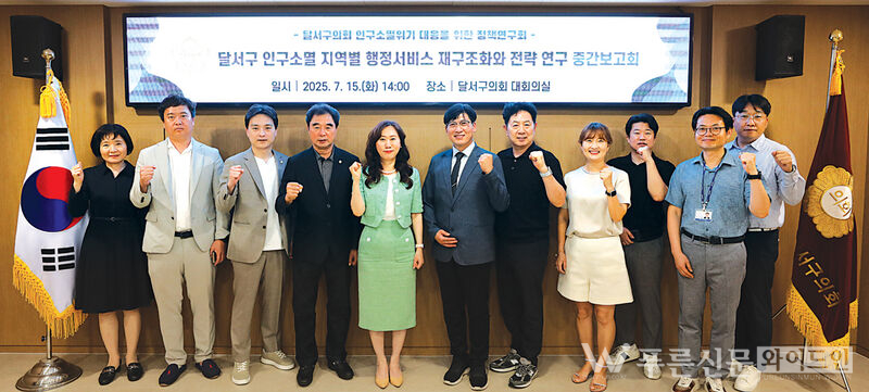 달서구의회 의원 연구단체 ‘달서구의회 인구소멸위기 대응을 위한 정책연구회’(대표 임미연 의원)와 제이티지역정책연구원(원장 황은성)은 지난 15일(화) 달서구의회 대회의실에서 ‘달서구 인구소멸 지역별 행정서비스 재구조화와 전략 연구용역’ 중간보고회를 열었다.