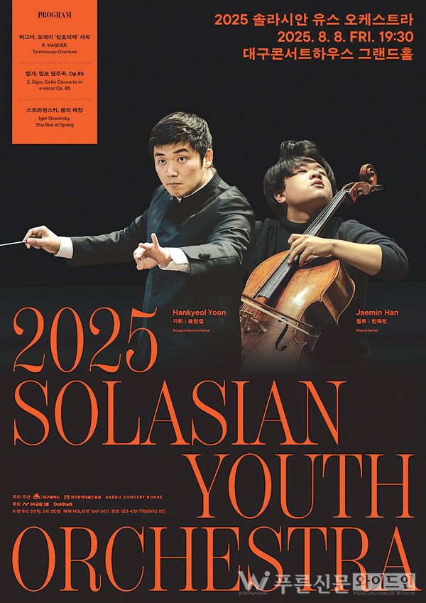 국내외 100여 명의 청년 음악가들이 오는 8월 8일(금) 대구콘서트하우스 그랜드홀에서 ‘2025 솔라시안 유스 오케스트라’ 공연을 선보인다. 일주일간 집중 연습과 교육을 거쳐 실력을 다진 이들은 바그너 서곡, 엘가 첼로 협주곡, 스트라빈스키 ‘봄의 제전’을 연주한다.