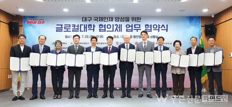 대구광역시는 지난 22일(화) 동인청사에서 달서구, 달성군, 계명대학교 등 지역 9개 대학과 함께 ‘대구 글로컬대학 협의체’ 업무협약을 체결했다.