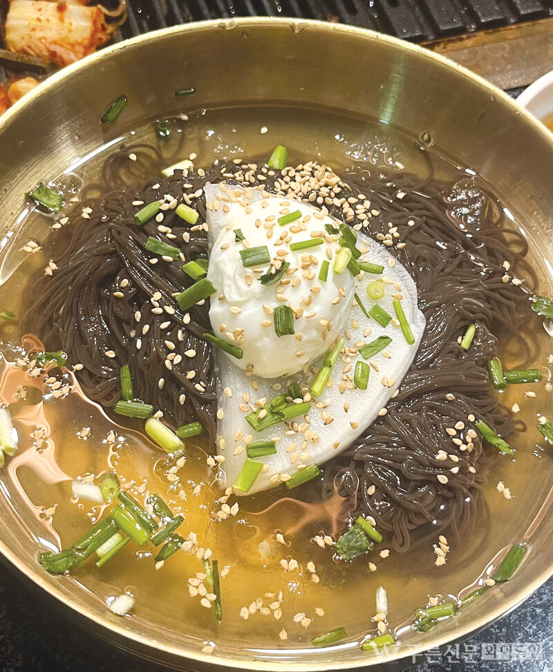 주문한 돼지 막창은 잡내 없이 고소하고 쫄깃했으며, 떡·파·버섯 등을 함께 구워 먹으니 식감과 풍미가 한층 살아났다. 고기와 곁들이기 좋은 사이드 메뉴인 냉면도 살얼음이 동동 띄워져 시원함을 더했다. 시원한 육수와 쫄깃한 면발이 구운 막창과 잘 어우러져, 여름철 더위 속 입맛을 돋우기에 충분했다.