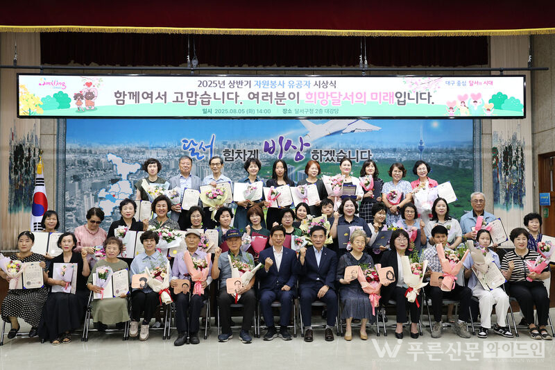 달서구는 지난 5일 구청에서 「2025년 상반기 자원봉사 유공자 시상식」을 열고, 지역사회를 위해 묵묵히 헌신해 온 자원봉사자들과 단체에 감사의 뜻을 전했다.
