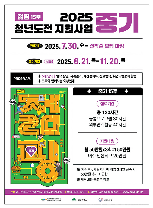 대구광역시는 미취업 청년들의 취업 역량 강화를 위한 ‘청년도전지원사업’인 ‘젊핑’ 중기 과정 참여자를 선착순 모집한다.