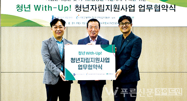 대구도시개발공사는 지난 21일(목) 대구광역시청소년자립지원관, 초록우산 어린이재단 대구지역본부와 함께 ‘청년 With-Up!’ 자립 지원사업 업무협약을 체결했다.