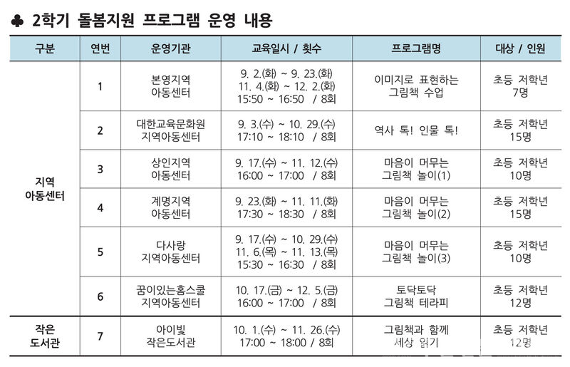 이번 프로그램은 달서구 관내 지역아동센터 6곳(계명·다사랑·대한교육문화원·본영·상인·홈스쿨)과 아이빛작은도서관 등 총 7개 기관과 협력해 진행된다. 가정과 학교 인근의 안전한 공간에서 돌봄이 이뤄지는 만큼, 학부모와 아동 모두 안심하고 참여할 수 있는 환경이 마련된다.