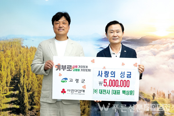 ㈜대전사(대표 백상훈)는 지난달 28일(일) 고령군청을 방문해 어려운 이웃을 위한 성금 500만 원을 기탁했다.