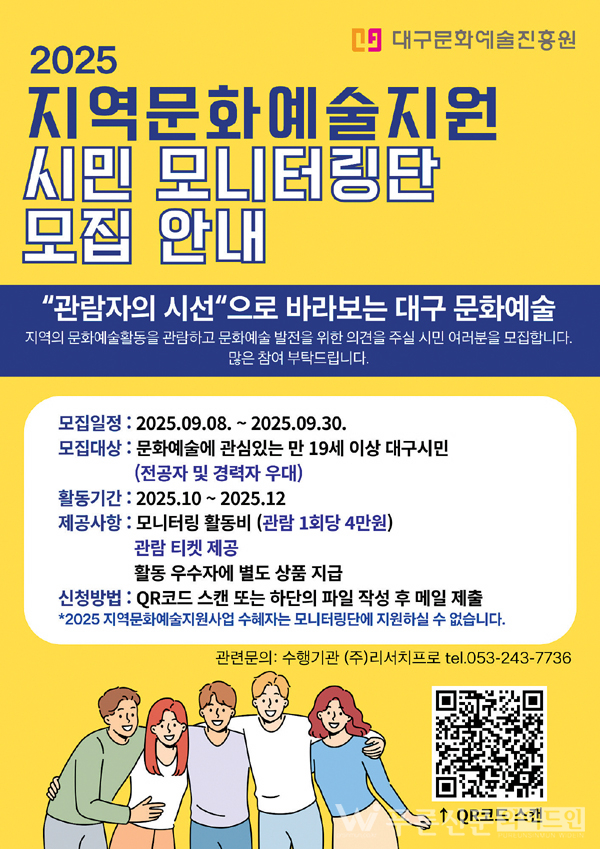 대구문화예술진흥원이 ‘2025 지역문화예술지원사업’ 시민 모니터링단을 모집한다.
