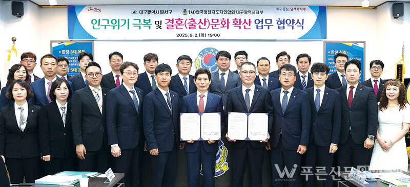 달서구-한국청년지도자연합회 대구지부, 인구 위기 대응 업무협약 체결 [자료제공=달서구청] 달서구는 지난 2일(화) (사)한국청년지도자연합회 대구지부와 초저출생 문제 극복과 긍정적 결혼문화 확산을 위한 업무협약을 맺었다.