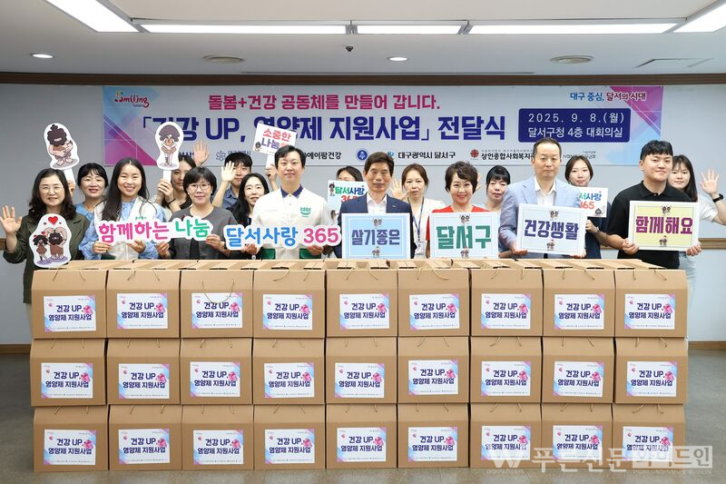달서구, 취약계층 성인 240명에 영양제 지원 [자료제공=달서구청]달서구는 지난 8일(월) 구청에서 ‘건강 UP, 영양제 지원사업’ 전달식을 열고, 기저질환이 없는 취약계층 성인 240명에게 종합영양제를 지원했다.