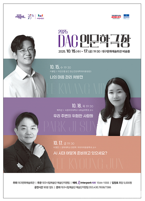 대구문화예술회관이 오는 10월 15일(수)~17일(금)까지 3일간 ‘2025 DAC 인문학극장’을 대구문화예술회관 비슬홀에서 연다.