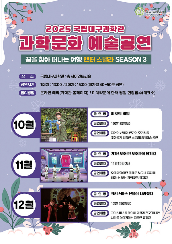 10~12월까지는 마술 공연 ‘씨앗의 비밀’, 우주 뮤지컬 ‘가자! 우주로!’, 가족 뮤지컬 ‘크리스마스 선물이 사라졌다’ 등 시즌3 문화예술 공연도 열린다. 공연은 홈페이지를 통해 사전 예약하거나 현장 접수로 관람할 수 있다.