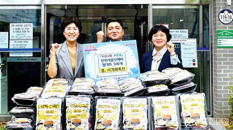 달서구 감삼동 지역사회보장협의체는 지난 21일(일) 고기굽스(대표 김창일)로부터 300만 원 상당의 한우사골수제비 밀키트 100팩을 기탁받아 관내 저소득 취약가정에 전달했다.
