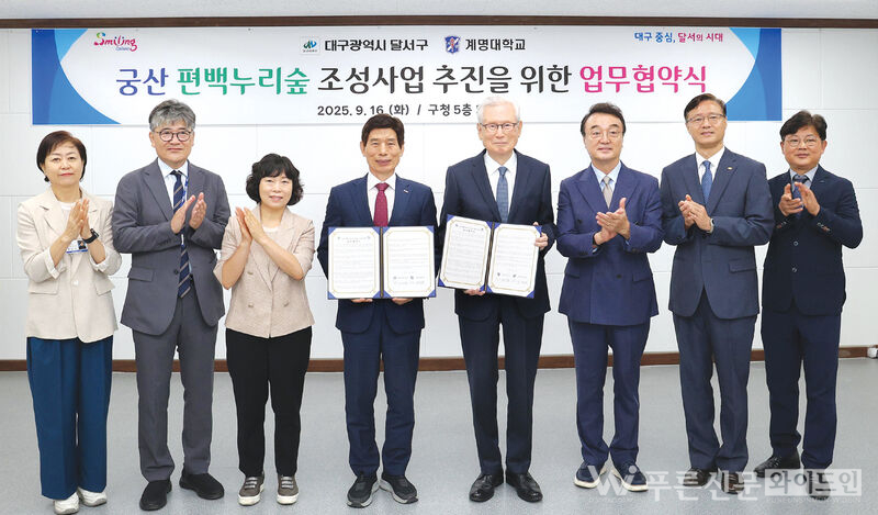 달서구와 계명대학교는 지난 16일(화) ‘궁산 편백누리숲 조성’을 위한 업무협약을 체결했다.