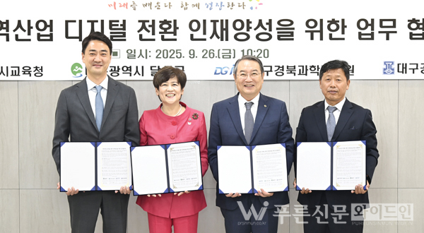 달성군·시교육청·대구과학기술원·대구공고, 디지털 인재 양성 업무협약 체결 [사진제공=달성군청]달성군과 대구시교육청, 대구경북과학기술원, 대구공업고가 지난달 26일(금) 디지털 산업 인재 양성을 위한 업무협약을 체결했다.