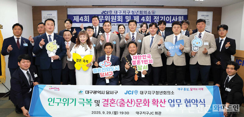 달서구는 지난달 29일(월) 대구지구청년회의소와 초저출생 극복 및 결혼문화 확산을 위한 업무협약을 체결했다.