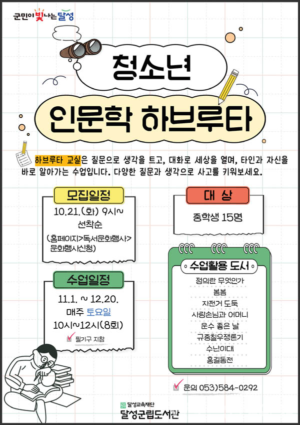 달성군립도서관이 중학생을 대상으로 한 인문학 독서토론 프로그램 ‘청소년 인문학 하브루타’ 참여자를 모집하고 있다.