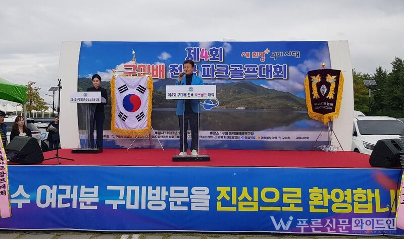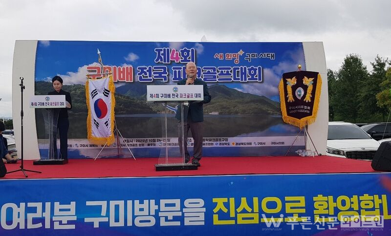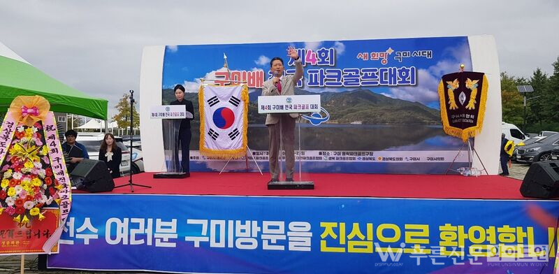 ▲최근 한국공공자치연구원이 주최한 ‘제30회 한국지방자치경영대상’에서 최고 영예인 ‘종합대상’을 수상한 구미시 김장호 시장이 “이번 대회가 단순한 스포츠 경기를 넘어 선수 여러분의 기량을 마음껏 펼치고 서로간의 우정을 나누며 구미의 따뜻한 정과 문화를 경험하는 축제의 장이 되기를 소망하며, 현재 구미시가 운영하고 있는 9곳 288홀을 더 확충할 계획이니 많이 방문하여 이용하시길 바란다”며 환영사를 하고 있다. 〔사진=김영조 기자〕