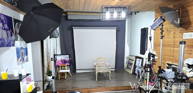 문을 열고 들어서면 아담한 공간이 눈앞에 펼쳐진다. 한쪽 벽면에는 세월의 흔적이 묻은 사진들이 가지런히 걸려 있고, 그 옆에는 다양한 카메라와 조명, 오래된 삼각대가 자리하고 있다. 단상 한가운데 놓인 작은 의자는 혼자 있을 때 다소 처연한 느낌을 주지만, 그 자리에서 찍힌 사진 속 사람들의 행복한 표정을 떠올리면 공간 전체가 따뜻하게 느껴진다.