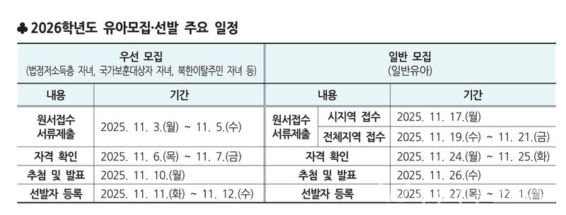 대상은 2020~2022년 출생 유아이며, 2023년 1~2월생은 조기입학이 가능하다. 모집은 ▲우선모집(11월 3~5일, 결과 11월 10일) ▲일반모집(11월 17~21일, 결과 11월 26일) ▲추가모집(12월 2일~2026년 2월 13일)으로 나뉜다.