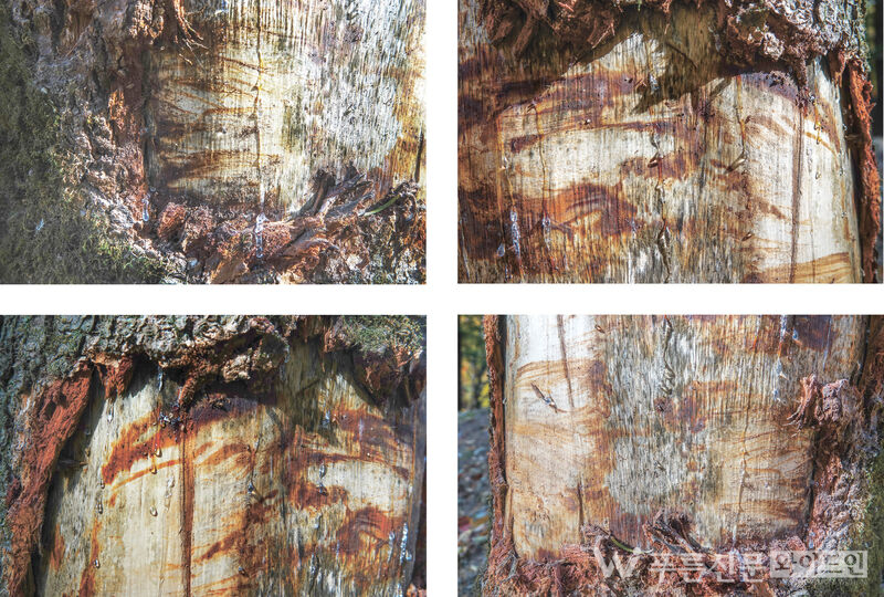 가벼운 산행 나섰다가 내려오는 길에 발길이 멈춰졌다. 수 없이 찍히고 잘려 나가며 피눈물을 흘린 듯한 나무둥치 앞이었다.