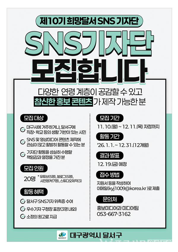 달서구는 구민이 직접 지역 소식을 전하는 제10기 ‘희망달서 SNS기자단’을 12월 11일(목)까지 모집한다.