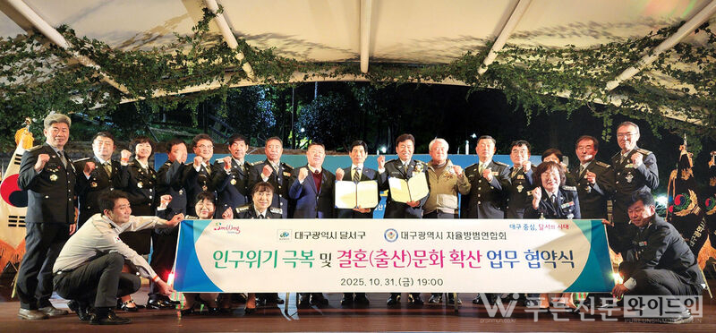 달서구는 지난달 31일(금) 대구광역시자율방범연합회와 초저출생 인구위기 극복과 긍정적 결혼문화 확산을 위한 업무 협약을 체결했다.