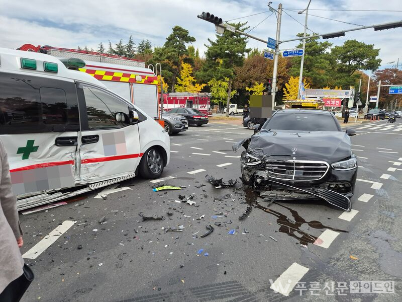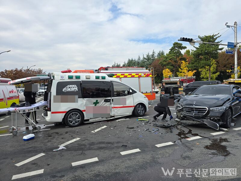 13일 경찰 등에 따르면 사고는 지난 12일 오전 11시 40분쯤 대구 달서구 신당네거리에서 발생했다. 직진 신호를 받고 이동하던 벤츠 승용차가 교차로를 통과하던 사설 구급차 오른쪽 측면을 들이받은 것이다.